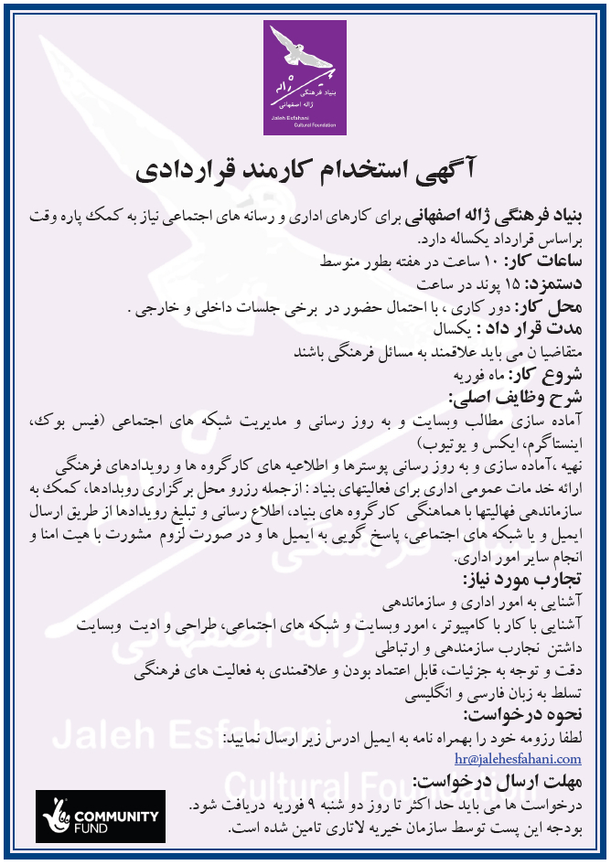 بنیاد فرهنگی ژاله اصفهانی برای کارهای اداری و رسانه های اجتماعی نیاز به کمک پاره وقت