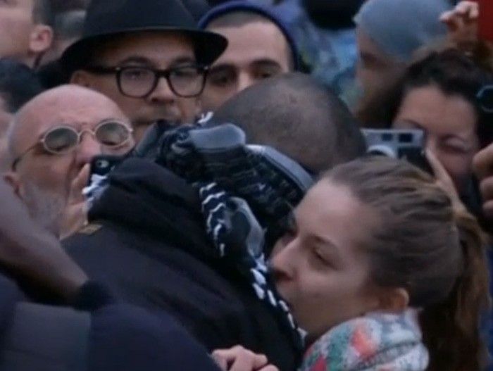 مردم دور او حلقه زدهاند. برخی یکی یکی میروند و مرد را در آغوش میگیرند و برخی هم از این صحنه عکس میگیرند.