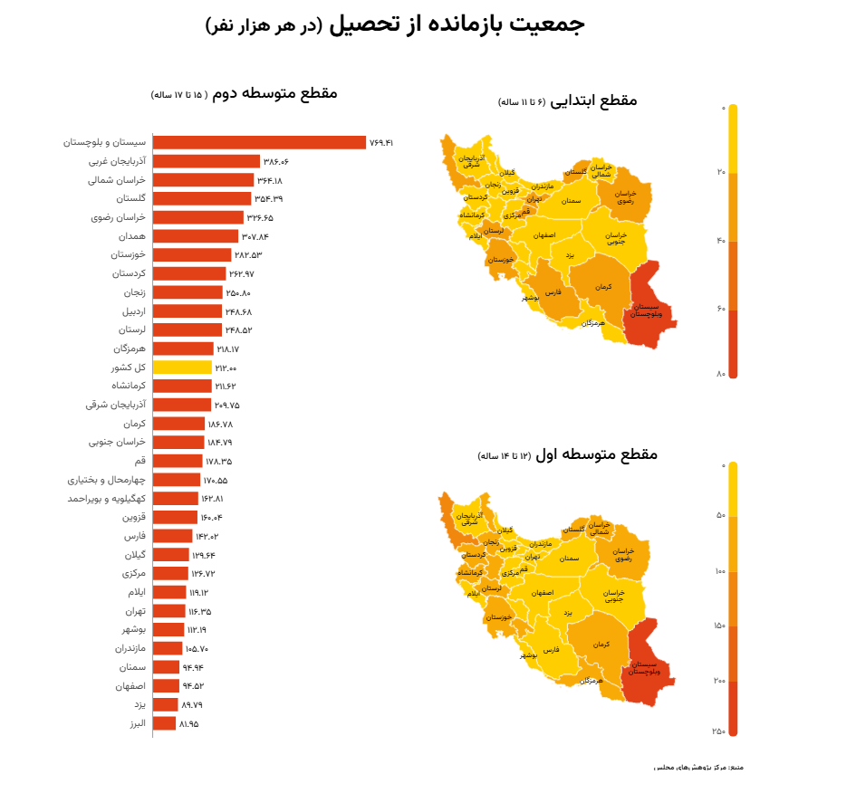 در مقابل، استانهای اصفهان، یزد و البرز در مقایسه با سایر استانها کمترین نرخ بازماندن از تحصیل را دارند و وضعیت بهتری را نشان میدهند.