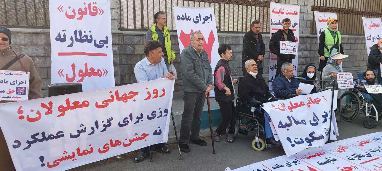 شماری از معلولان در ایران همزمان با روز جهانی معلولان در اعتراض به اجرا نشدن قانون حمایت از معلولان مصوب سال ۸۶ و افزایش مشکلات معیشتی و درمانی مقابل مجلس شورای اسلامی تجمع کردند. معلولان با اعتراض به ادعای گرامیداشت این روز از سوی دولت میگویند تا زمانی که حتی یک فرد دارای معلولیت پشت نوبت دریافت ویلچر، عصا یا کمکهزینه معیشتی باشد، هیچ جشن و گرامیداشتی موضوعیت ندارد.