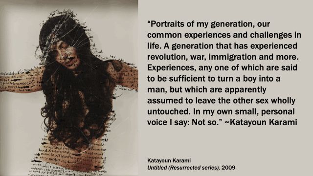 یکی از رادیکالترین نمونههای استفاده از بدن در هنر معاصر ایران، آثار کتایون کرمی است. دکتر شاهنده بهطور ویژه به اثر «رستاخیز» (۲۰۰۹) اشاره کرد؛ اثری که در آن کرمی بدن خود را در هیئتی مسیحگون و رنجکشیده بازنمایی میکند. این تصویر، که با شیشهی شکسته و نوشتارهایی به زبان فارسی و انگلیسی همراه است، به شکاف عمیق میان باور فردی و ایدئولوژی رسمی اشاره دارد.