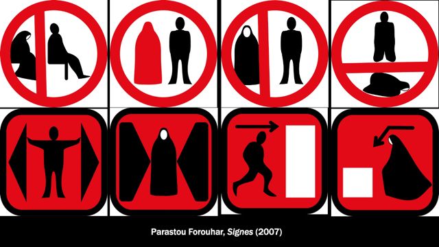 در میان نمونههای مورد بحث، آثار پرستو فروهر جایگاهی محوری داشت. دکتر شاهنده به مجموعهی «نشانهها» (۲۰۰۷) پرداخت؛ آثاری که با استفاده از زبان بصری علائم راهنمایی، تابلوهای ترافیکی و نشانههای ایمنی شهری، سازوکارهای کنترل جنسیتی را آشکار میکنند. این تصاویر در نگاه نخست ساده، خنثی و حتی آشنا به نظر میرسند، اما دقیقاً همین آشنایی است که قدرت انتقادی آنها را تشدید میکند.