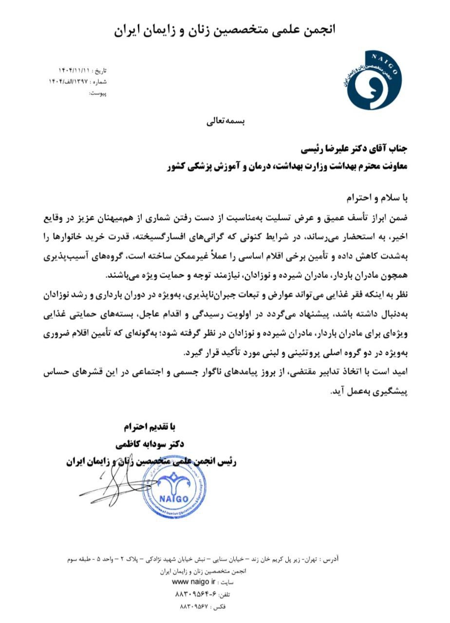 در این نامه آمده «در شرایط کنونی که گرانیهای افسارگسیخته، قدرت خرید خانوارها را به شدت کاهش داده و تأمین برخی اقلام اساسی را عملاً غیرممکن ساخته است، گروههای آسیبپذیری همچون مادران باردار، مادران شیرده و نوزادان نیازمند توجه و حمایت ویژه میباشند.»